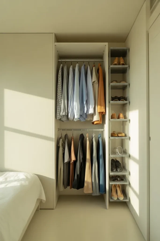 • Double rods: If your closet ceiling is high, use a double rod system for more hanging space.